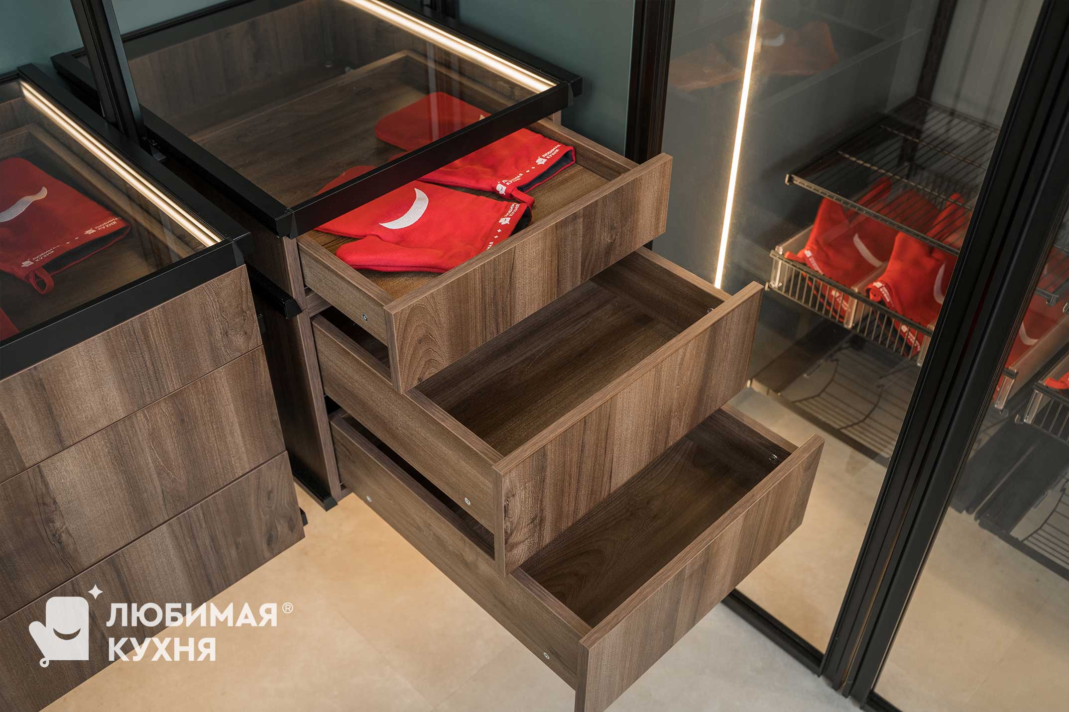 Стильная гардеробная, невероятно вместительная и продуманная до мелочей. В полках предусмотрена подсветка, для отличного обзора вещей даже без основного освещения. Системы хранения — полки,ящики,сетки, все продумано для комфортного расположения различных вещей вашего гардероба.