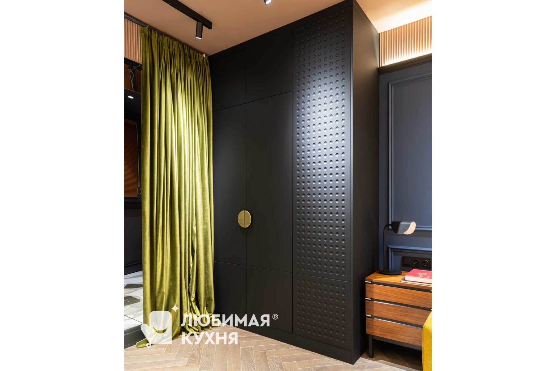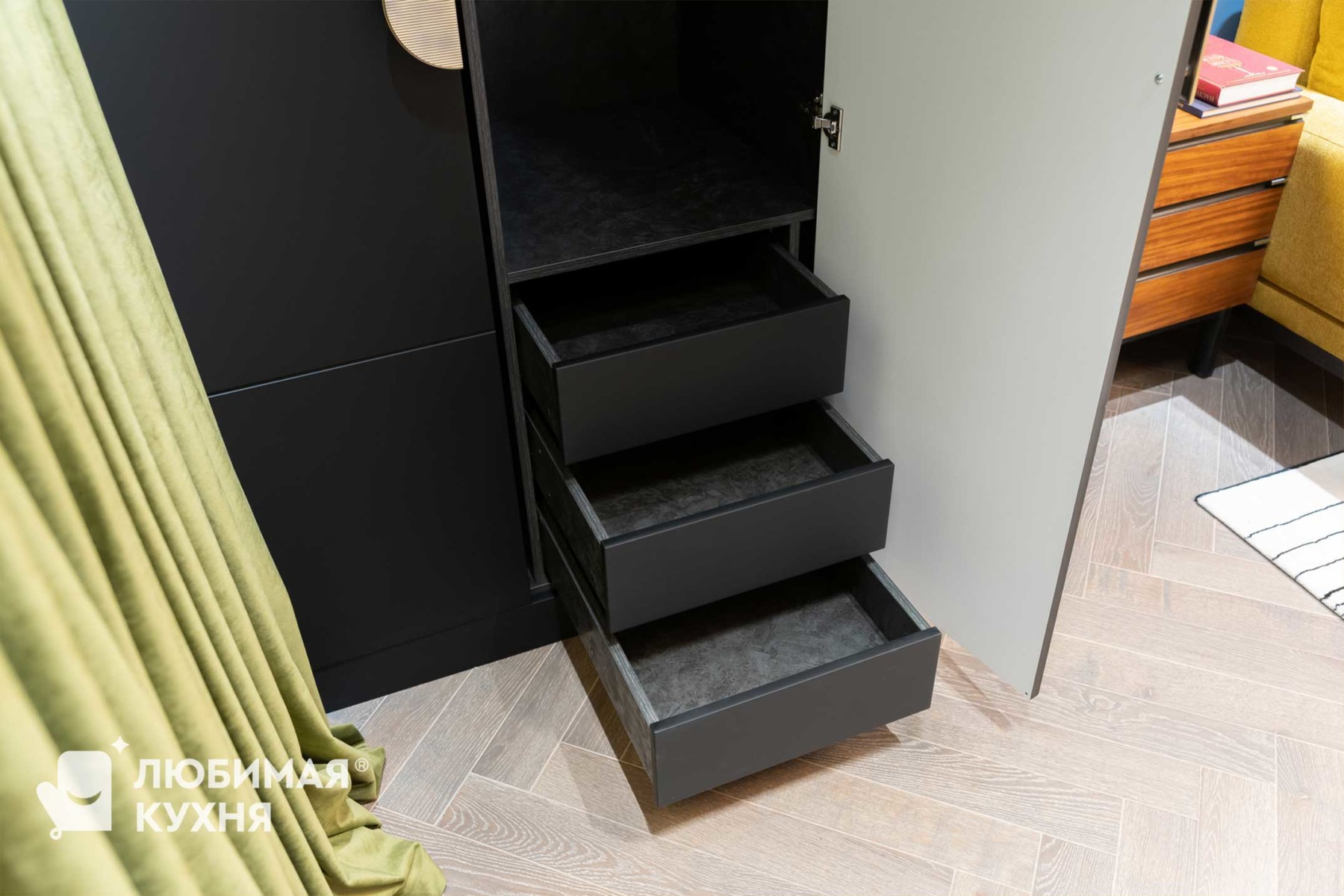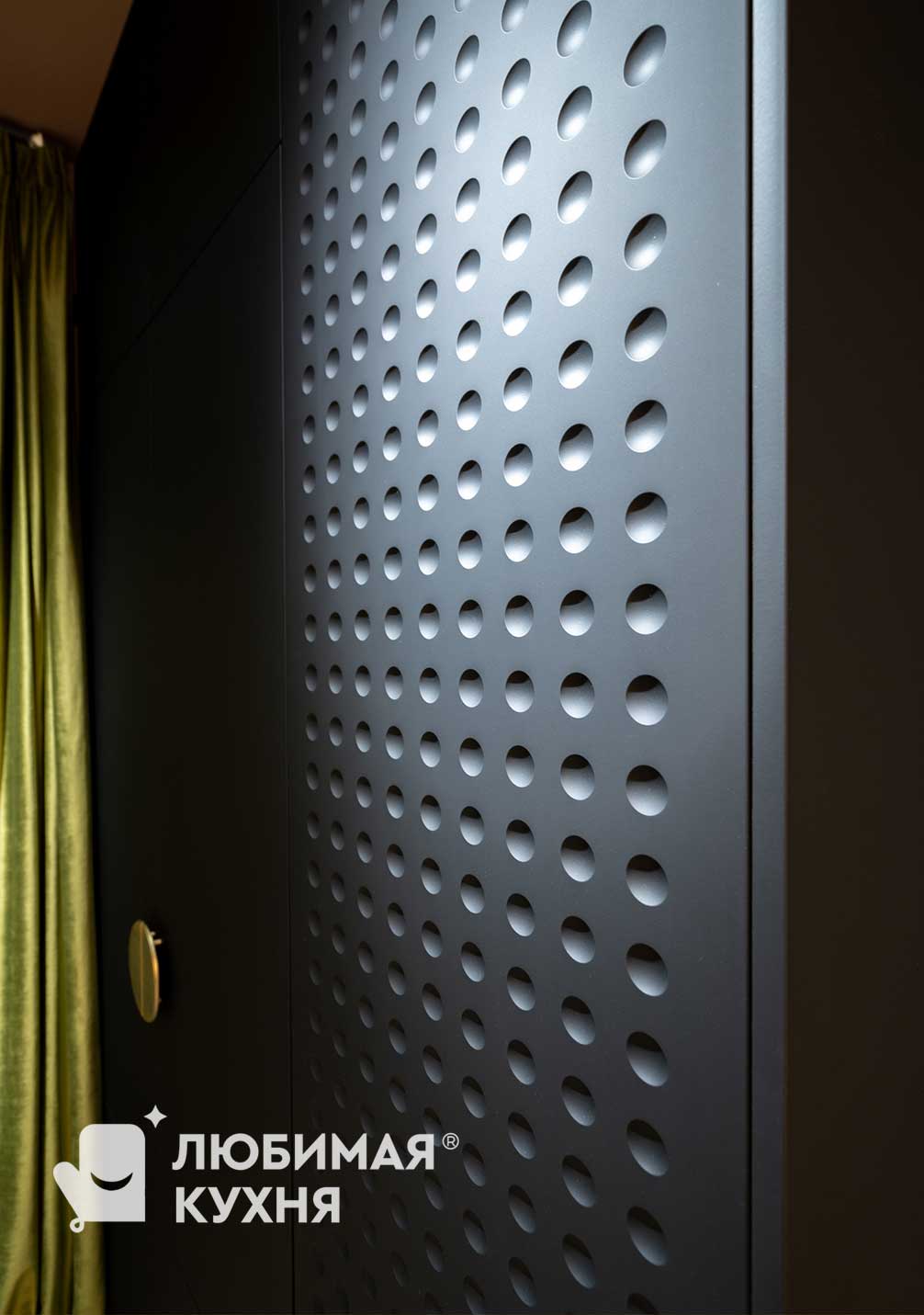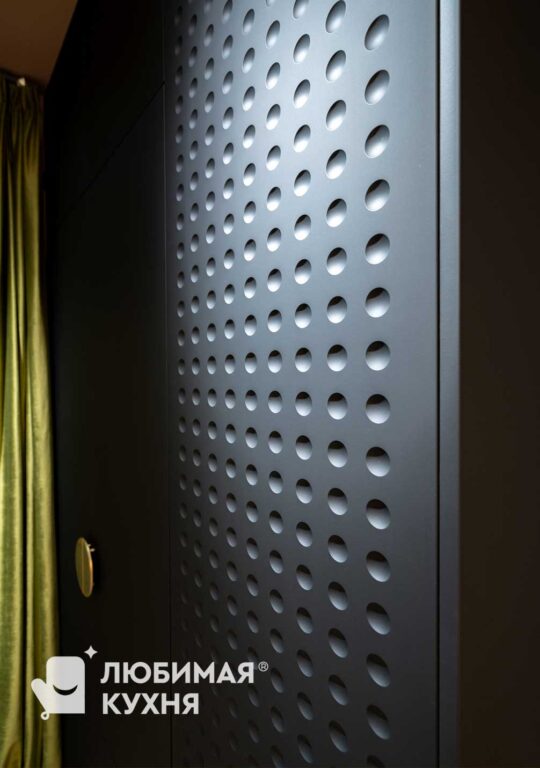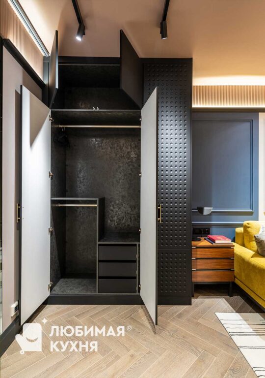 Для программы Квартирный вопрос дизайнер Зуева Анна создала платяной шкаф, который мы с радостью реализовали! Платяной шкаф, так необходимый в спальне, всегда съедает место. Но темный объект на темном фоне не смотрится слишком массивным. Зато внутри поместятся все вещи наших героев. Легкое тиснение на фасадах создает шелковистый эффект, при этом отпечатки на поверхности не остаются. А шика лаконичной композиции добавила золотистая ручка, отсвечивающая на дверцах, как закатное солнце. Шкаф из двух отделений. В первом отделении расположены двухуровневые штанги для размещения вещей на вешалках и отделение с выдвижными ящиками. Во втором отделении полки.