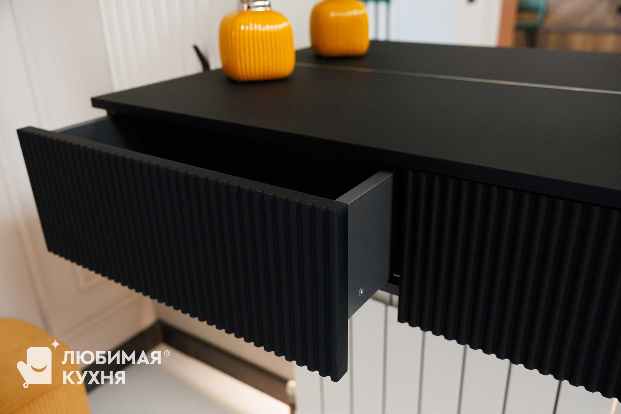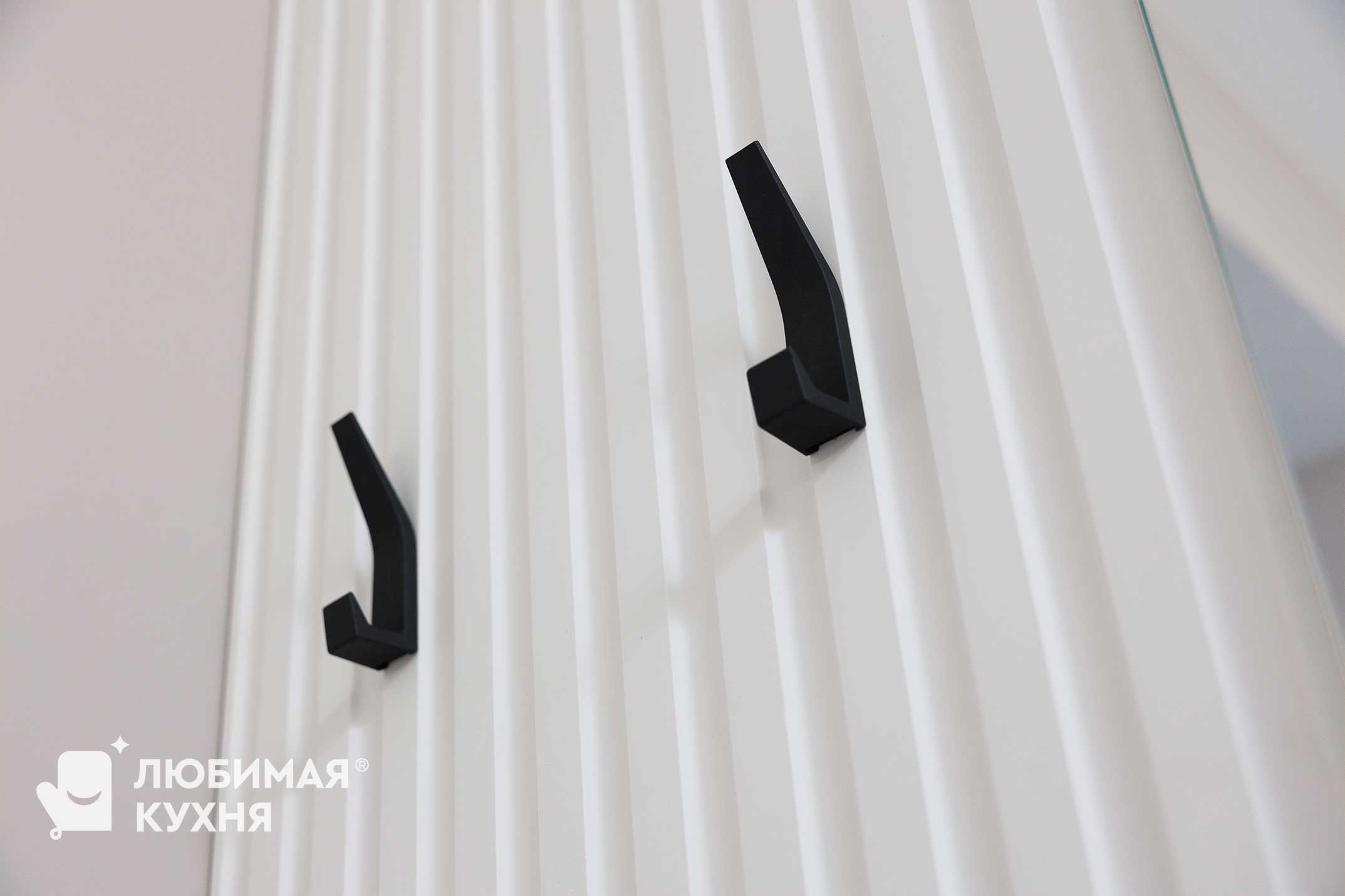 Стильная зона для прихожей в современном минималистичном дизайне. Подвесная консоль чёрного цвета с рифленым фасадом эффектно контрастирует со светлыми стенами и создаёт лёгкое ощущение парения. Рифленая стеновая панель и круглое зеркало с мягкой подсветкой по периметру визуально расширяет пространство и добавляет уюта, создавая функциональную и эстетичную входную зону.