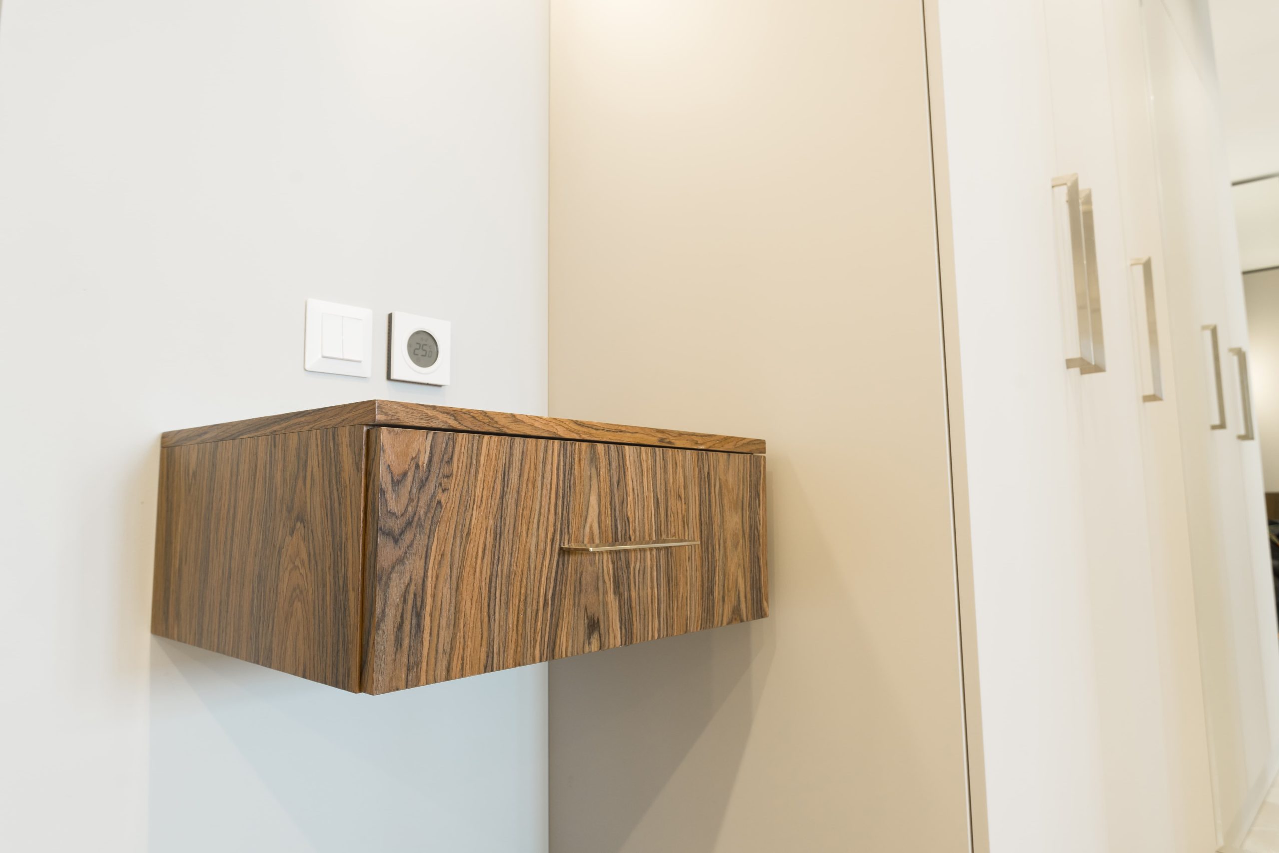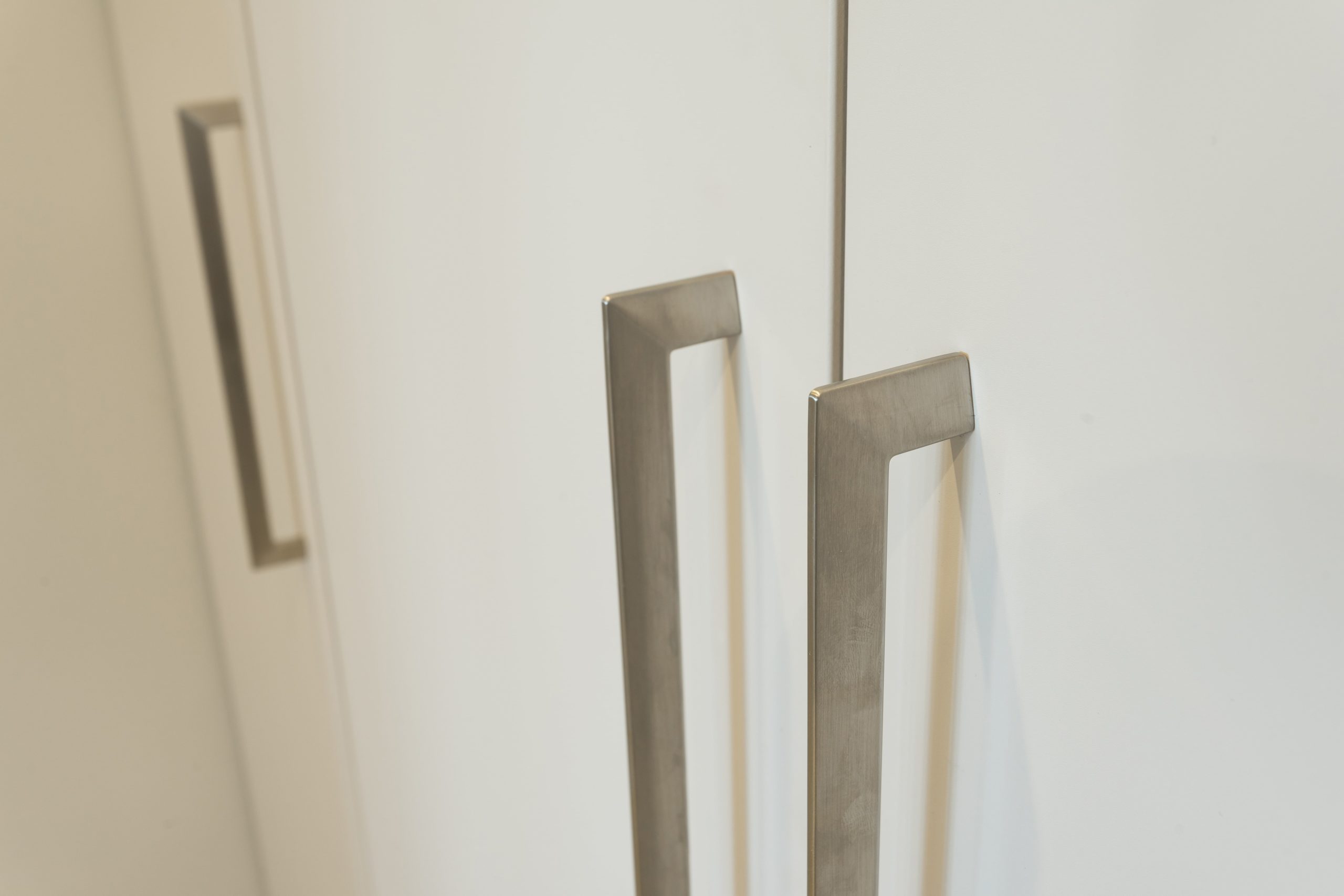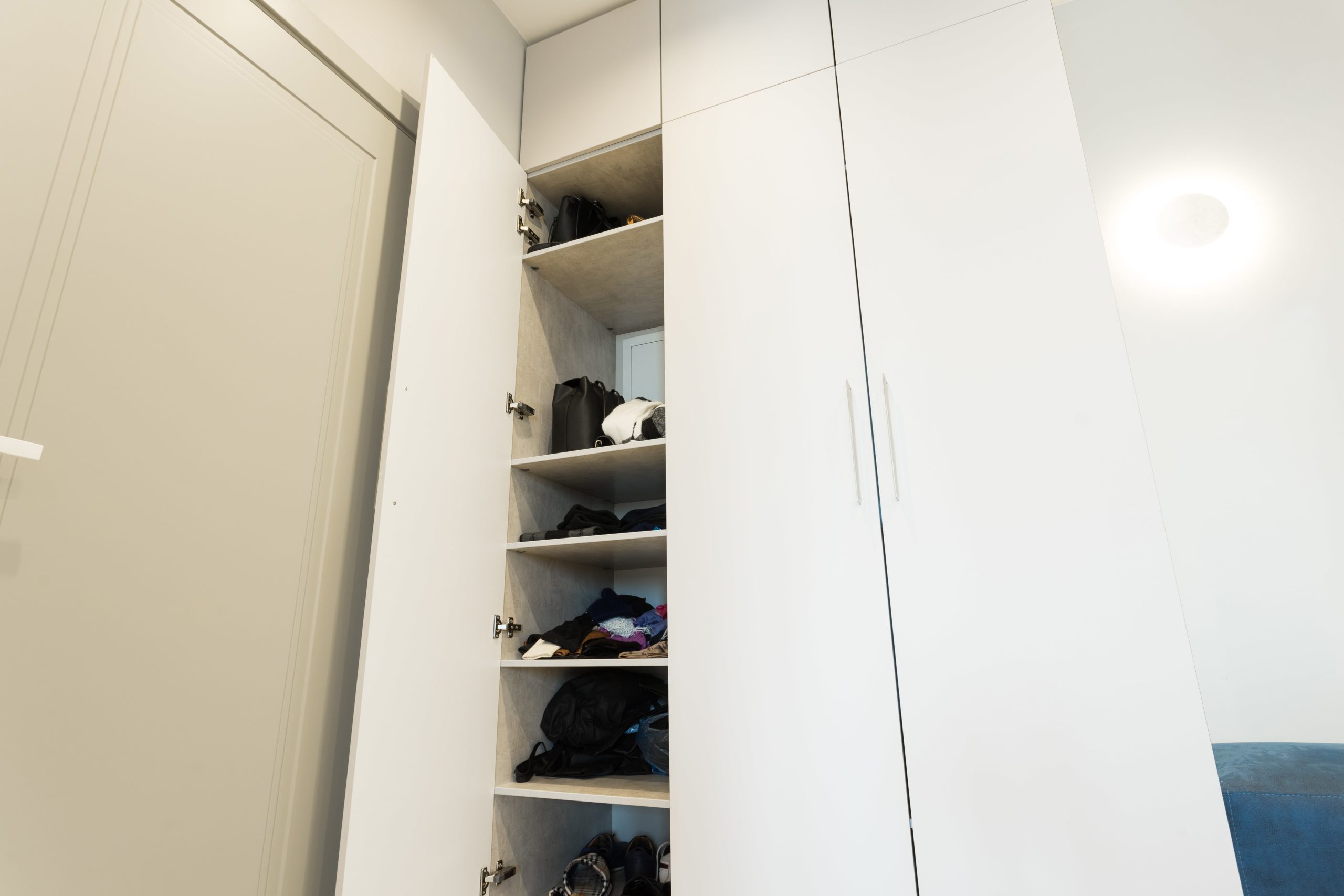 Вместительные шкафы в прихожую с распашными дверьми для верхней одежды, обуви и прочих аксессуаров. Шкафы, несмотря на большую вместимость, доходят до потолка, что создает ощущение единого пространства и визуально расширяет его. Фасады светлого цвета в тон стенам так же работают на увеличение пространства.