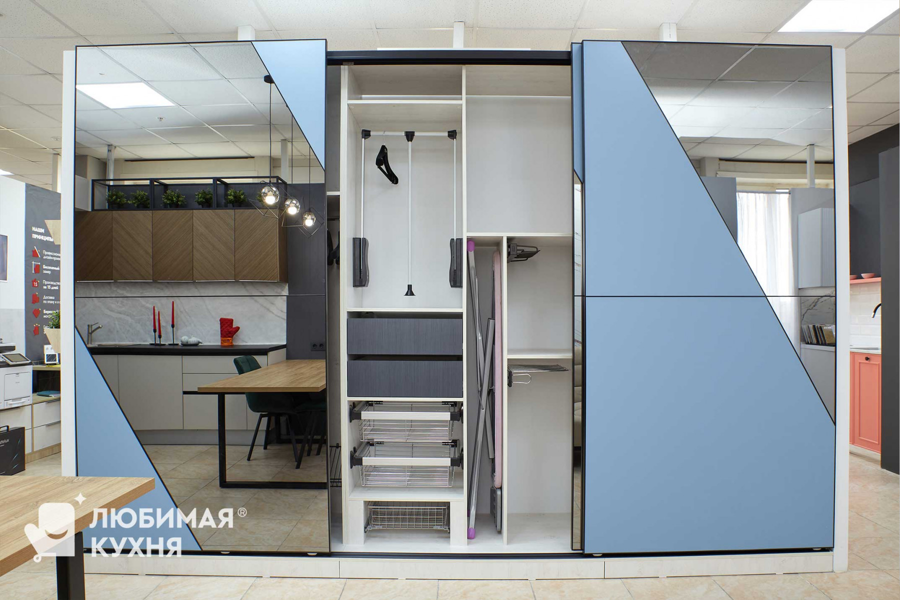 Шкаф скомплектован тремя дверями-купе. За каждой дверцей удобно расположены полки и штанги. Шкаф оснащен всем необходимым: пантографом для одежды на плечиках, выдвижными ящиками и корзинами для мелких вещей, брючницей, галстучницей, есть отделение для хранения гладильной доски.