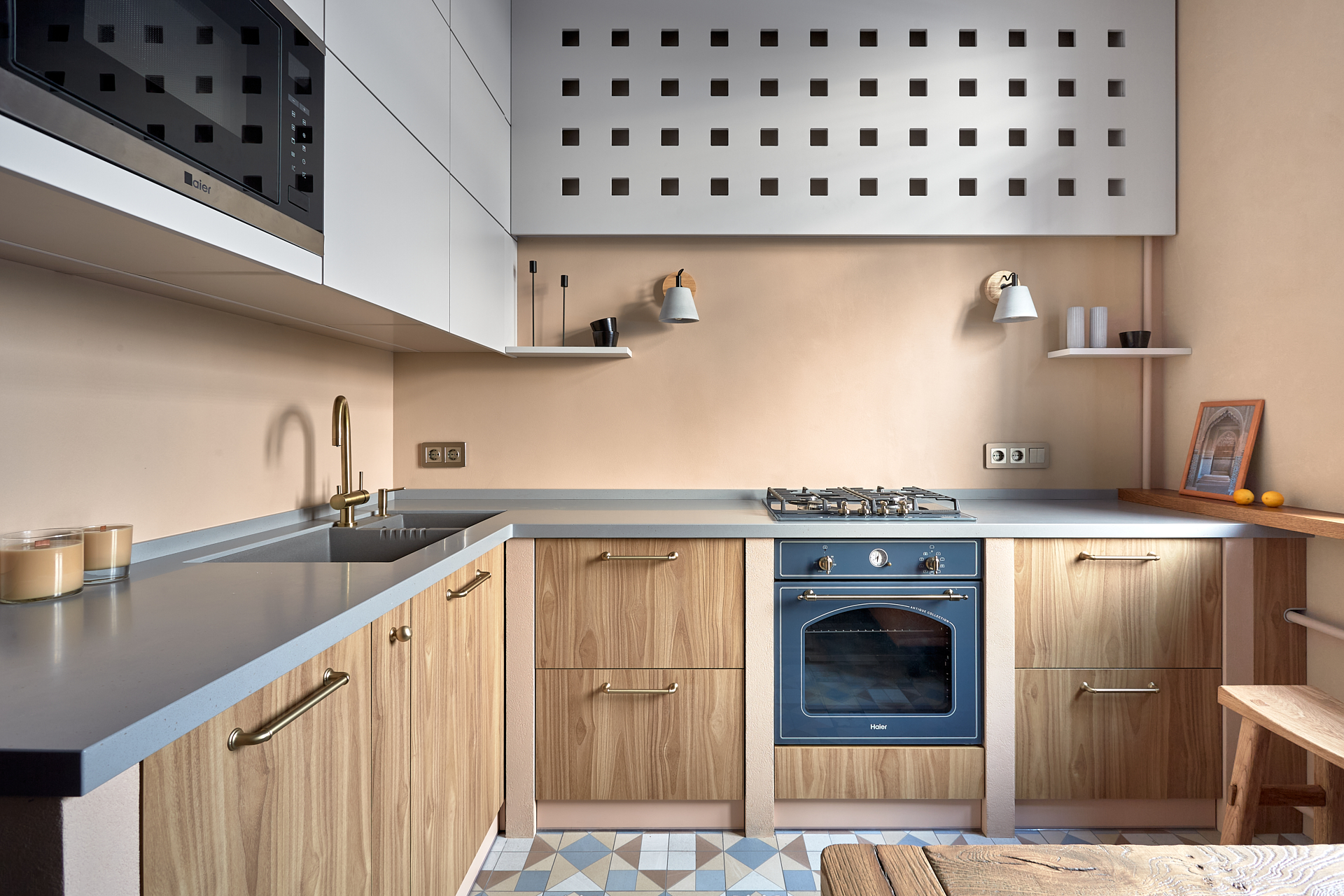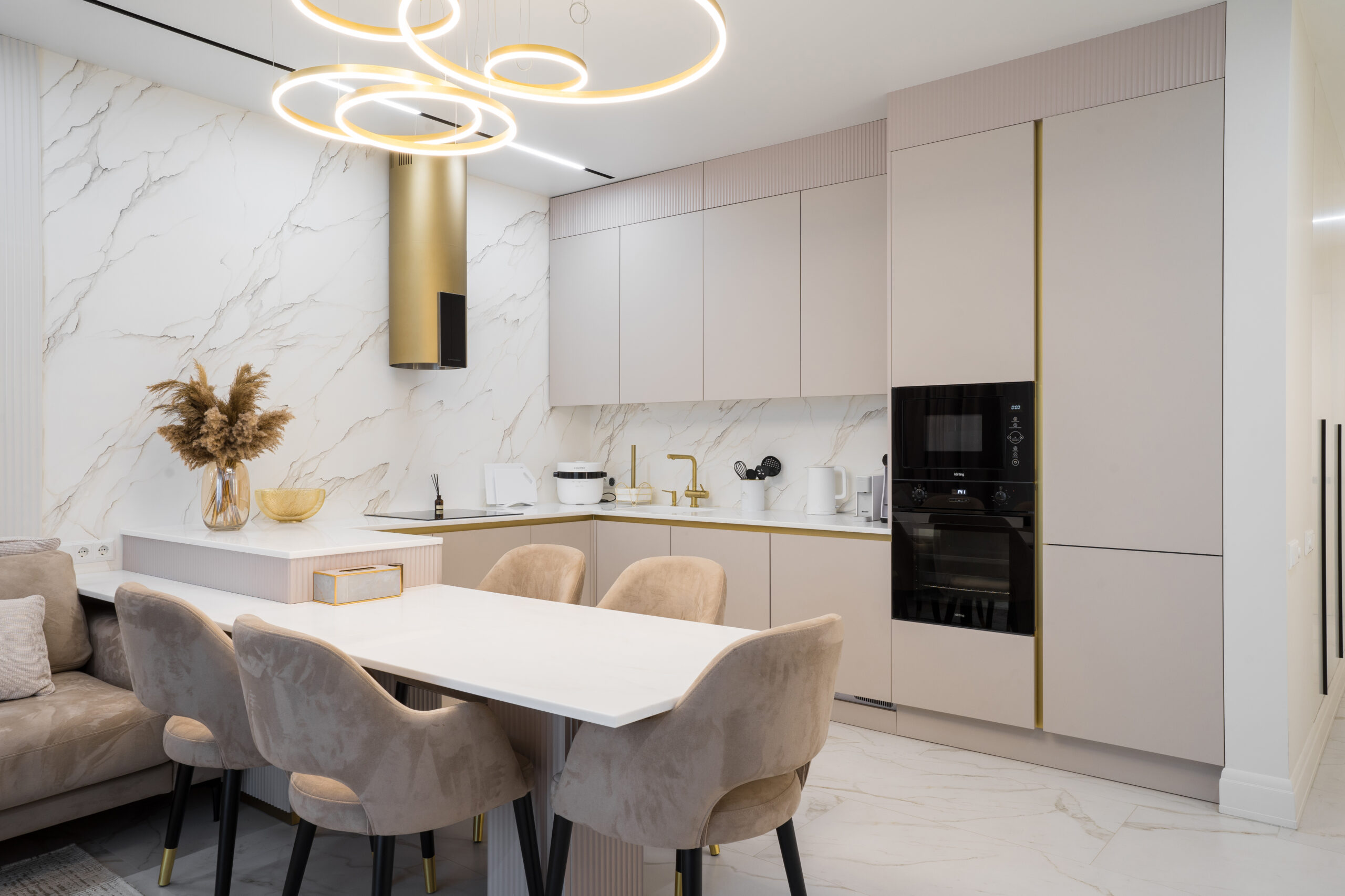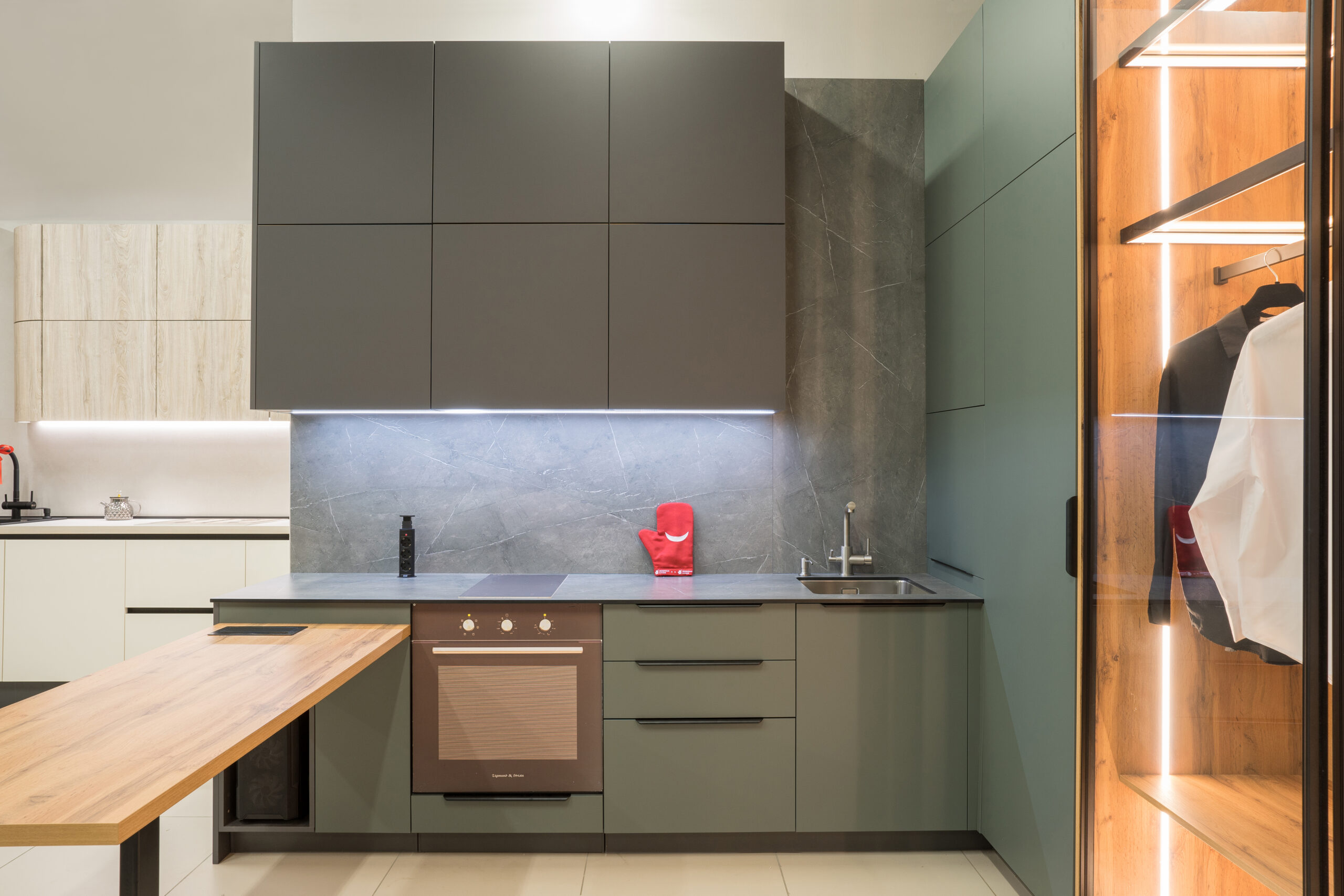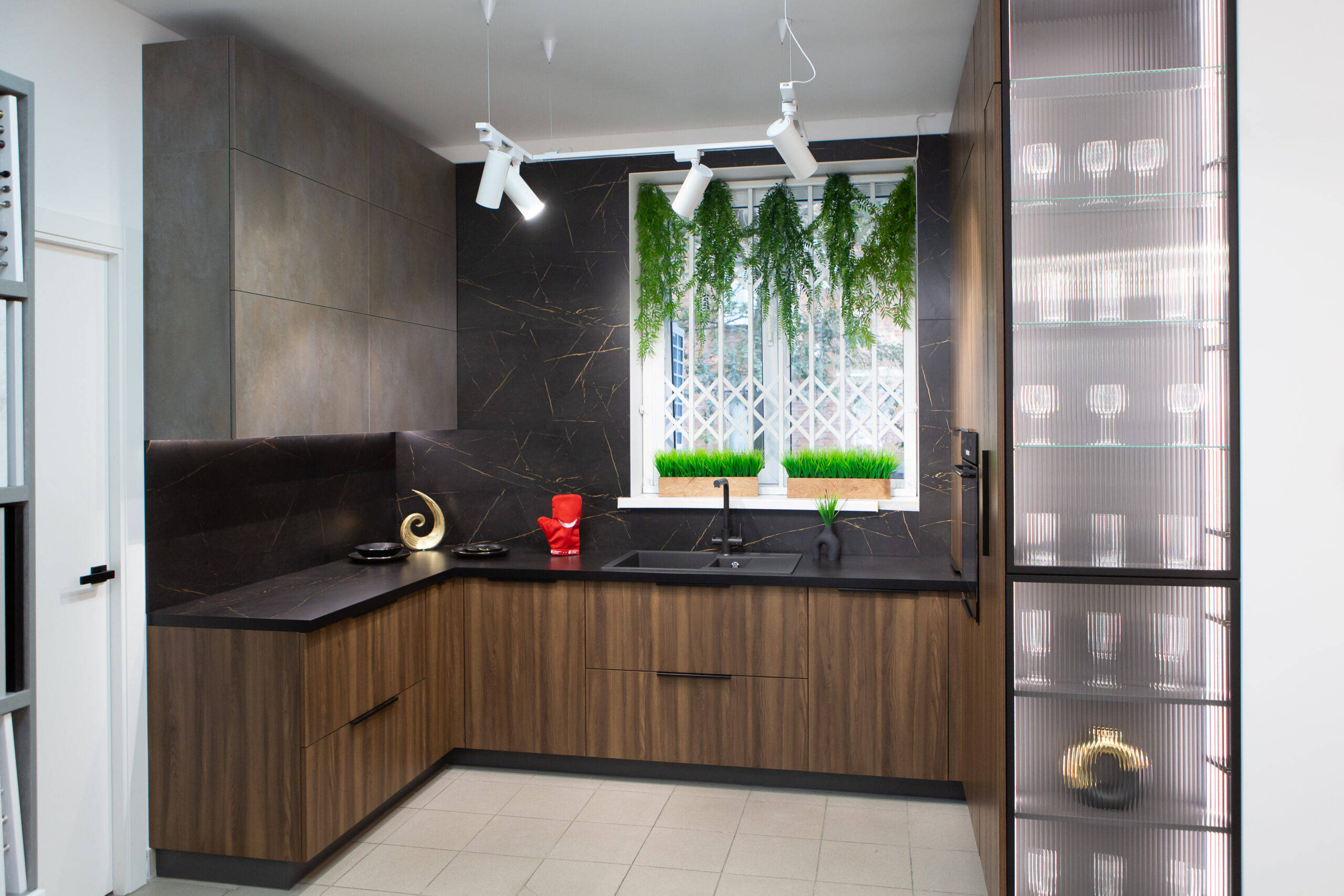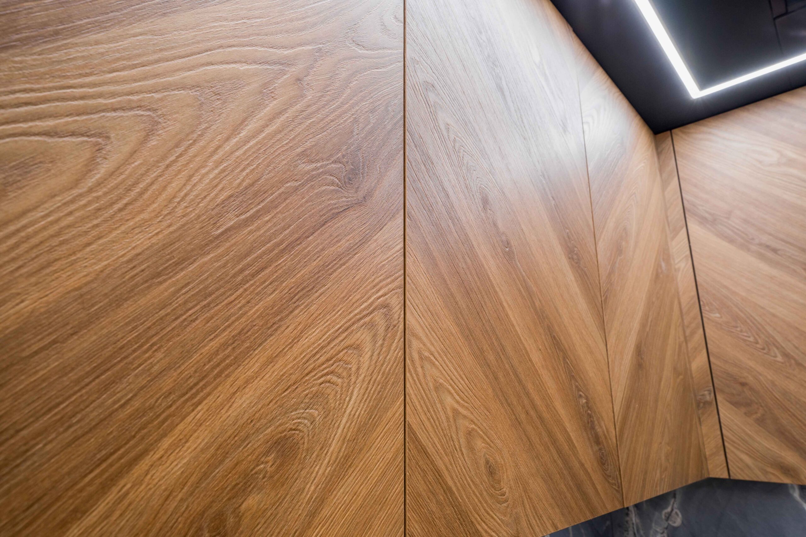 Фасады с покрытием пластик имею основу из МДФ или ЛДСП. Покрыты глянцевым, матовым однотонным, древесным с глубокими порами, бетонным или каменным декорами. Мы подбираем только декоры, которые подходят для кухонного пронстрантсва. Выдерживают механическое воздействие моющими средствами и выдерживают перепады температур.
